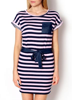 Sukienka w paski - styl marynarski, krótki rękaw wykończony zakładka z guzikiem, dekolt okrągły, na piersi kieszonka, w talii pasek do wiązania, paski imitują jeans, fason tuby.Materiał 92% (bawełna+poliester), 8% spandex.Modelka wzrost 175cm, na co dzień nosi S/M, rozmiar z prezentacji produktu M