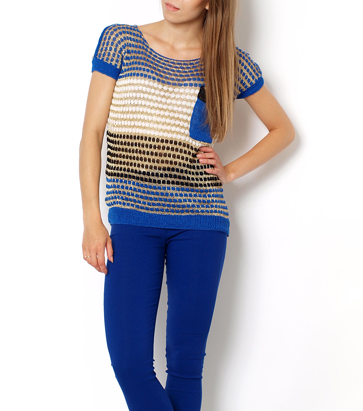 Śliczny sweterek z krótkim rękawem. Kolorowa bluzka ze złotą nitką, która nadaje całości niepowtarzalnego charakteru. Dekolt okrągły, rękawki oraz dół zakończone delikatnymi ściągaczami. Na wysokości piersi imitacja kieszeni. Bardzo wygodna, a przy tym niesamowicie efektowna. Można ją nosić samodzielnie, bądź np. na top na ramiączkach. Pasuje na wiele okazji. Dostępna w ślicznych kolorach do wyboru.Skład: 35% bawełna, 65% poliester.Wzrost modelki: 175cmNa co dzień nosi rozmiar: S