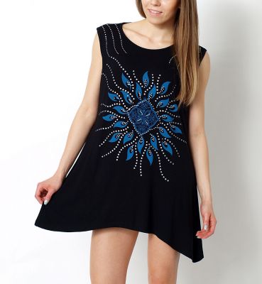 Wyjątkowa rozkloszowana tunika. Długa bluzka o mega modnym asymetrycznym kroju. Tunika bez rękawów, z ciekawym nadrukiem z przodu, z dyskretnie połyskującymi dodatkami. Od talii rozszerzająca się ku dołowi. Wykonana z elastycznego, ładnie układającego się na sylwetce materiału. Świetna propozycja dla pań o każdym typie sylwetki, oraz tych, które chcą ukryć niedoskonałości figury. Bardzo wygodna, a zarazem efektowna. Idealna na ciepłe letnie dni.Skład: 95% wiskoza, 5% elastan.Wzrost modelki: 172cmModelka ma na sobie: rozmiar z metki M/LNa co dzień nosi rozmiar: S/M