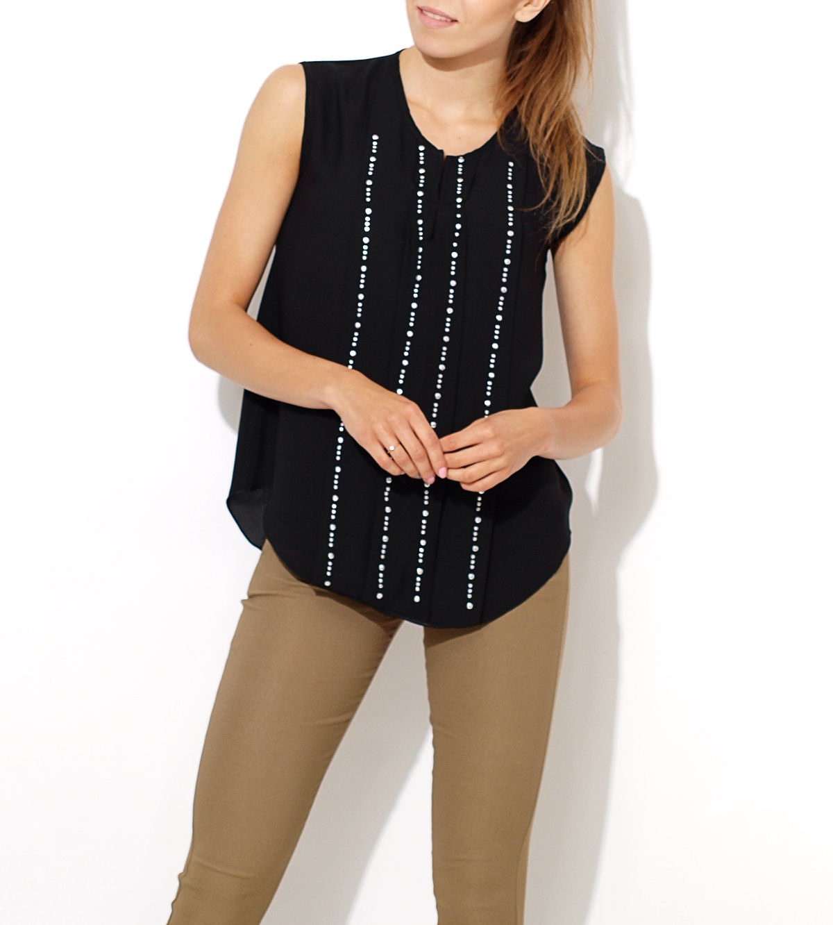 Piękna szyfonowa bluzka bez rękawów. Elegancka mgiełka z pionowymi zakładkami z przodu. Zdobiona dżetami. Dekolt okrągły z subtelnym rozcięciem. Na sylwetce prezentuje się bardzo kobieco i elegancko. Materiał z którego jest wykonana, jest zwiewny oraz przyjemny w dotyku. Bluzka idealnie nadaje się do pracy w zestawie z klasycznymi rurkami, jednak z powodzeniem można ją również nosić do legginsów, letnich szortów, bądź w wersji wieczorowej np. do modnych, rozkloszowanych spódniczek.Skład: 100% poliester.Wzrost modelki: 172cmModelka ma na sobie: rozmiar z metki S/MNa co dzień nosi rozmiar: S/M