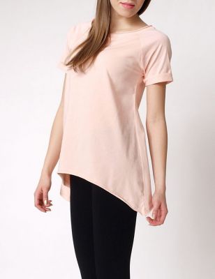 Wyjątkowa, bardzo kobieca bluzka. Trapezowy rewelacyjny krój, bardzo modny w tym sezonie. Tunika z krótkim rękawem. Surowo wykończona. Dekolt okrągły. Asymetryczna, boki dłuższe. Ładnie skrojony, przyjemny w dotyku bawełniany materiał. Luźna, zwiewna i bardzo wygodna.Skład: 95% bawełna, 5% elastan.