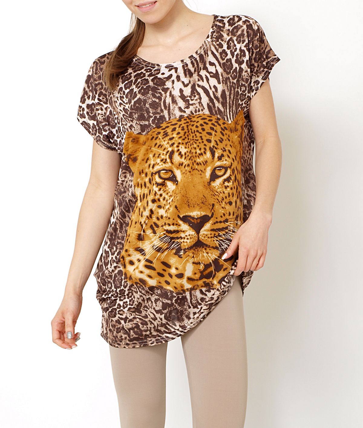 Wyjątkowa tunika z nadrukiem z lampartem. Wygodna bluzka o luźniejszym szerokim kroju. Dekolt okrągły. Na dole, po bokach delikatne drapowania. Idealna do jeansów, szortów, czy legginsów. Na sylwetce prezentuje się naprawdę efektownie. Modny trend na printy ze zwierzęcym motywem, sprawia, że nasza bluzka jest obowiązkową pozycją w tym sezonie, w każdej kobiecej szafie.Skład: 65% bawełna, 35% poliester.