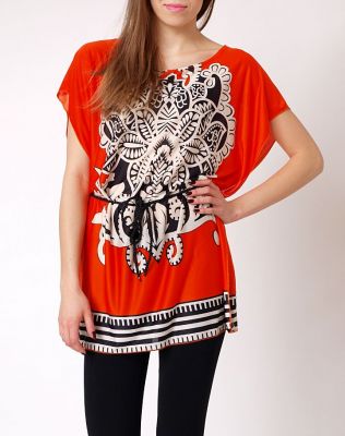 Wyjątkowa bluzka z krótkim rękawem. Wzorzysta tunika typu motyl. Wiązana w talii sznureczkiem. Wykonana z półmatowego, przyjemnego materiału dobrego gatunkowo. Ładnie układa się na sylwetce. Idealna pozycja na stworzenie niezwykle efektownej i modnej stylizacji.