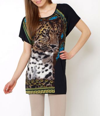 Niepowtarzalna tunika z nadrukiem, ze zwierzęcym motywem. Niezwykle stylowa, a zarazem seksowna i drapieżna. Idealna do legginsów, jeansów, czy getrów o długości 3/4. Wykonana z przyjemnego, półmatowego materiału. Można ją nosić samodzielnie, bądź wiązaną w talii, z dołączoną do bluzki tasiemką. Modny, luźny krój, świetnie układa się na sylwetce.Skład: 65% bawełna, 35% poliester.