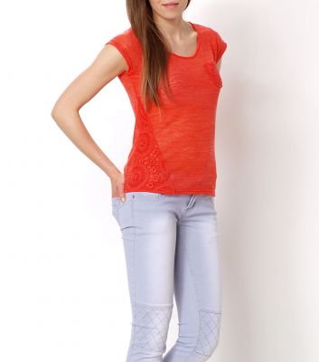 Modna, letnia bluzeczka z ażurowymi wstawkami, które dodają jej niebanalnego charakteru. Klasyczny krój. Wykonana z półkryjącego, cieniowanego materiału. Z przodu, na wysokości piersi kieszonka. Rękawki krótkie, dekolt okrągły. Bardzo wygodna i praktyczna. Perfekcyjnie sprawdzi się noszona na co dzień, jak również w bardziej formalnych zestawieniach. Skład: 80% bawełna, 15% poliester, 5% elastan.