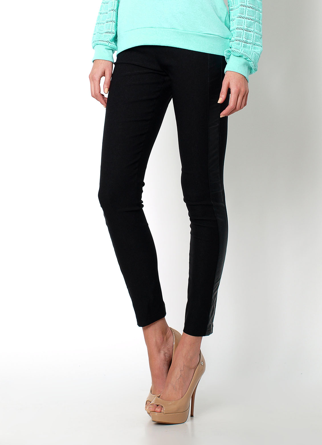 Spodnie/rurki wyszczuplające, lampasy z ekoskóry wzdłuż nogawek, elastyczny materiał, w pasie gumka, z tyłu imitacje kieszeni.Materiał 70% bawełna, 20% poliester, 10% elastan. Modelka wzrost 175cm, na co dzień nosi S/M, rozmiar z prezentacji produktu XL