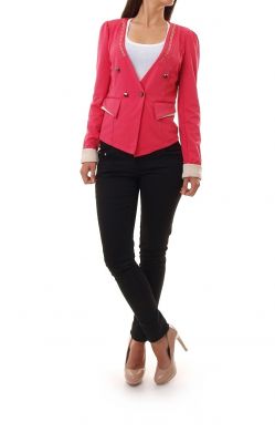 Żakiet z kieszeniami, zdobiony z przodu łańcuszkiem i koronką. Na barkach w części wewnętrznej wszyte są poduszki. Zapinany na stylowe guziki. Rękawy zakończone mankietem. Wykonany z materiału przyjemnego w dotyku. Marynarka z wcięciem w talii co sprawia, że fajnie dopasowuje się do sylwetki. Skład: 65% bawełna, 35% poliester