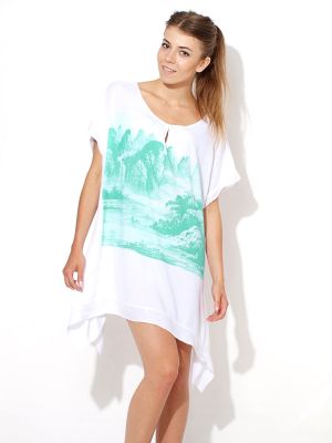 Stylowa, bardzo efektowna tunika. Niepowtarzalne urozmaicenie wielu letnich stylizacji. Długa, asymetryczna bluzka z ciekawym nadrukiem. Świetnie sprawdzi się noszona np. z kolorowymi legginsami. Krótkie rękawki oraz dół bluzki, wykończone subtelnie połyskującymi cekinami. Nadruk zdobiony kolorowymi cyrkoniami. Dekolt okrągły, z wycięciem, zapinanym na guziczek. Szeroka tunika w modnym, luźnym stylu. Idealnie ukryje drobne niedoskonałości sylwetki, bądź atrakcyjnie wyeksponuje jej atuty.Skład: 100% bawełna.Wzrost modelki: 172cmModelka ma na sobie: rozmiar z metki MNa co dzień nosi rozmiar: S/M