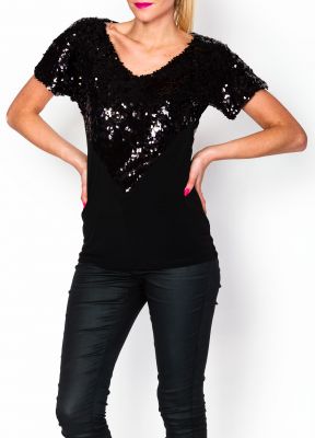 Czarna bluzeczka, luźny bardzo kobiecy fason na bal, karnawał i inne imprezy. Lekko nietoperzowy fason. Dekolt w kształcie litery V. Przód do połowy ozdobiony cekinami. Elastyczny materiał. Rękaw krótki. Produkt turecki dobrej jakości.Imprezowa, wieczorowa bluzeczka idealna na wiele okazji, zdobiona błyszczącymi dodatkami - ciekawy pomysł na ożywienie i dodanie garderobie oryginalnego looku w bardzo kobiecym stylu. Idealna, by wyglądać modnie oraz atrakcyjnie pokazać atuty sylwetki - pięknie podkreśli sylwetkę, eksponując dekolt i ramiona. Materiał 95% poliester, 5% lycraModelka wzrost 175cm, na co dzień nosi rozmiar S/M