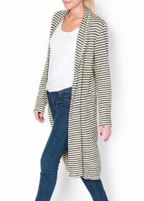 Długi kardigan - sweter damski - w wąskie poziome paski. Długie rękawy. Szalowy kołnierz. Prosty oversizowy fason - w zależności od noszonego rozmiaru kardigan będzie luźniejszy, bądź bardziej dopasowany. Produkt turecki dobrej jakości.Popularny i ponadczasowy wzór w paski i długi krój - wygodna i kobieca propozycja na jesienno - zimowy okres. Kardigan midi long optycznie wydłuży i wyszczupli sylwetkę, idealny jako ciepłe i wygodne dopełnienie casualowego stroju.Materiał 90% bawełna, 10% elastan.Modelka wzrost 175cm, na co dzień nosi rozmiar S/M