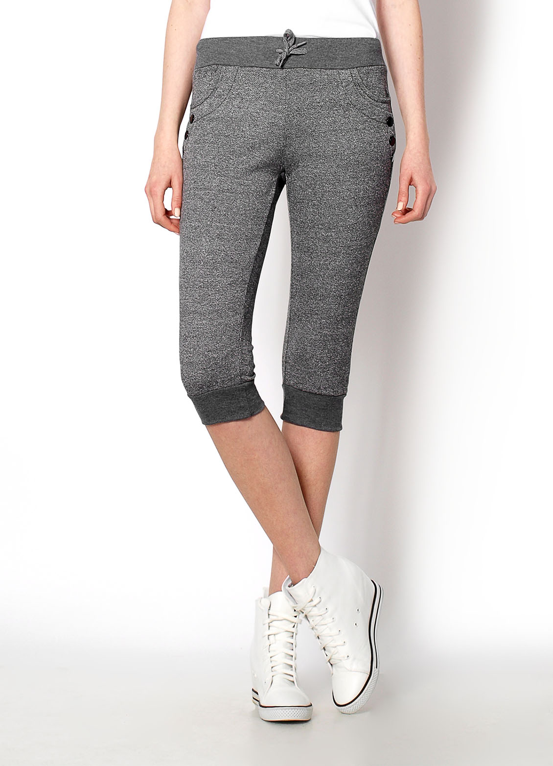 Dzianinowe rybaczki. W pasie elastyczna gumka za sznurkiem do regulacji. Z przodu kieszenie z ozdobnymi butonami. Nogawki z bezuciskowym ściągaczem. Idealne zarówno do butów sportowych jak i do obcasów. Materiał 65% bawełna, 35% poliesterModelka wzrost 175cm, na co dzień nosi S/M, rozmiar z prezentacji produktu M.