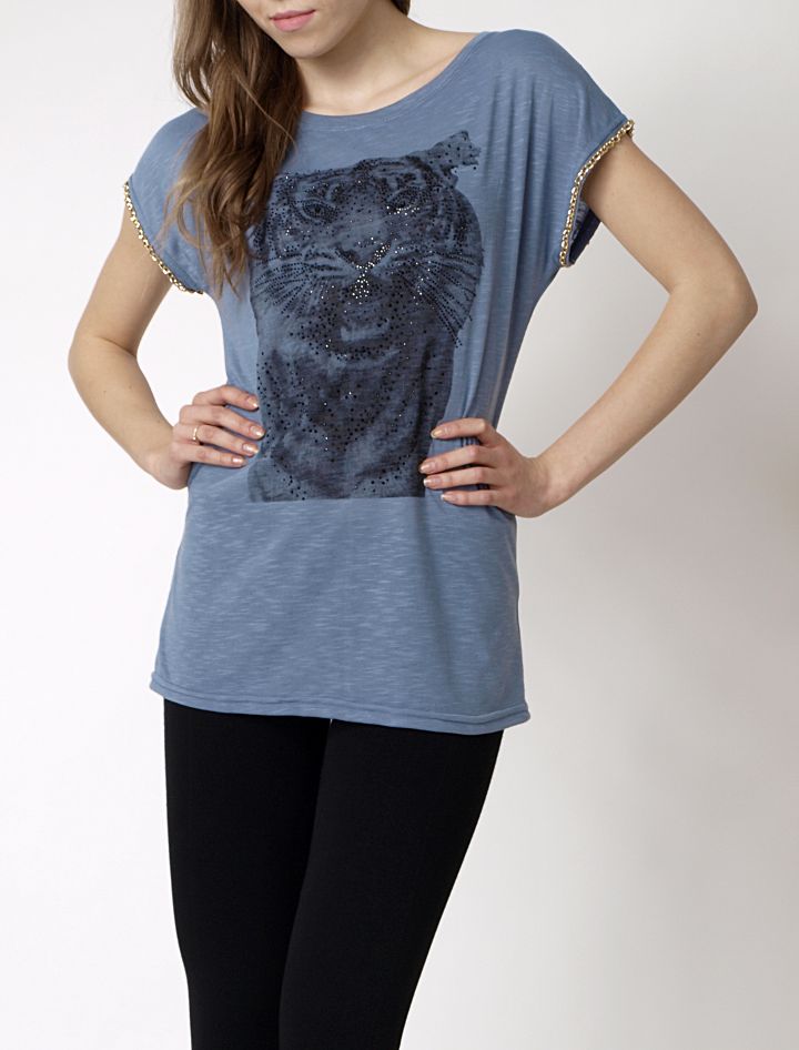 Oryginalna bluzka zapinana na plecach na suwak. Z przodu nadruk z tygrysem, wykończony błyszczącymi kamyczkami. Złote łańcuszki na rękawkach dodają bluzce niebanalnego charakteru. Miły w dotyku materiał. Bardzo wygodna i komfortowa. Dostępna w pięknych wiosennych kolorach.Skład: 65% bawełna, 35% poliester.