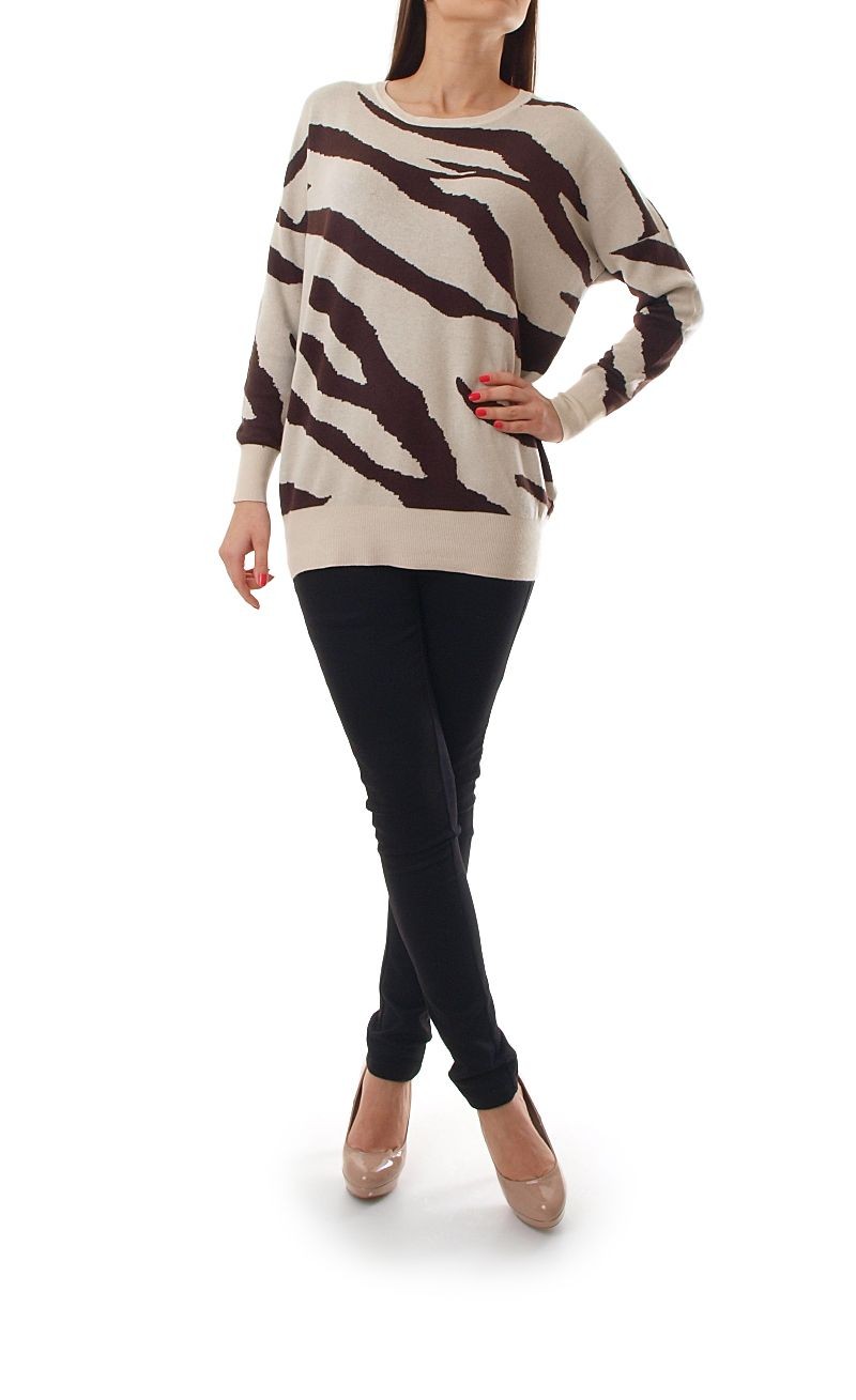 Oryginalny sweter z motywem zebry. Sweter z z długim rękawem. Miękki, przyjemny w dotyku. Dół oraz rękawy zakończone elastycznym ściągaczem. Bardzo modny sweter o luźnym kroju. Świetnie sprawdzi się noszony do spodni jak i grubych legginsów.Skład: 45% wiskoza, 45% nylon, 10% poliester.