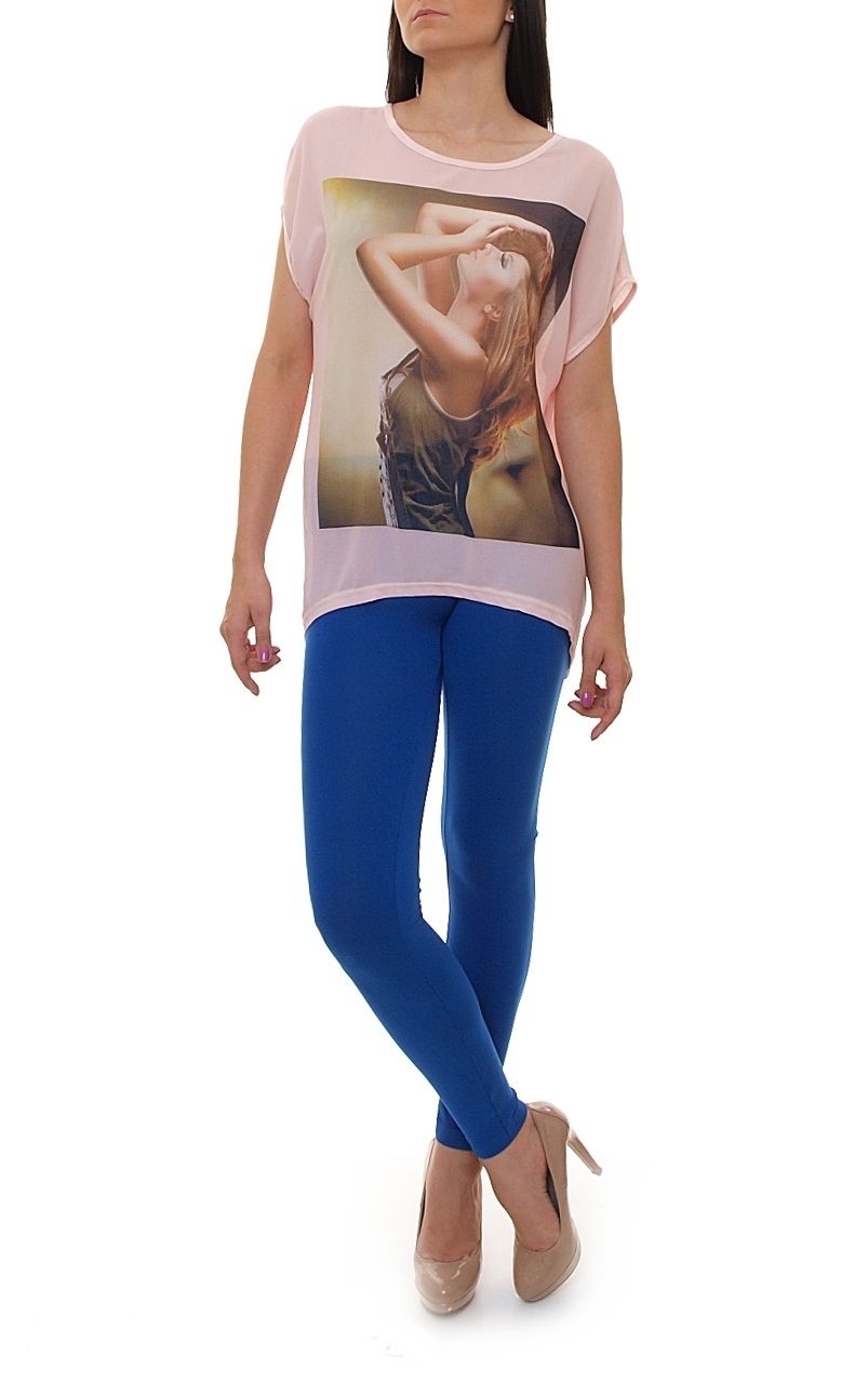 Modna bluzka z dużym nadrukiem z wizerunkiem kobiety. Bawełniana i wygodna bluzka w delikatnych kolorach. Asymetryczna bluzeczka - tył troszkę dłuższy.Skład: 65% bawełna, 35% poliester
