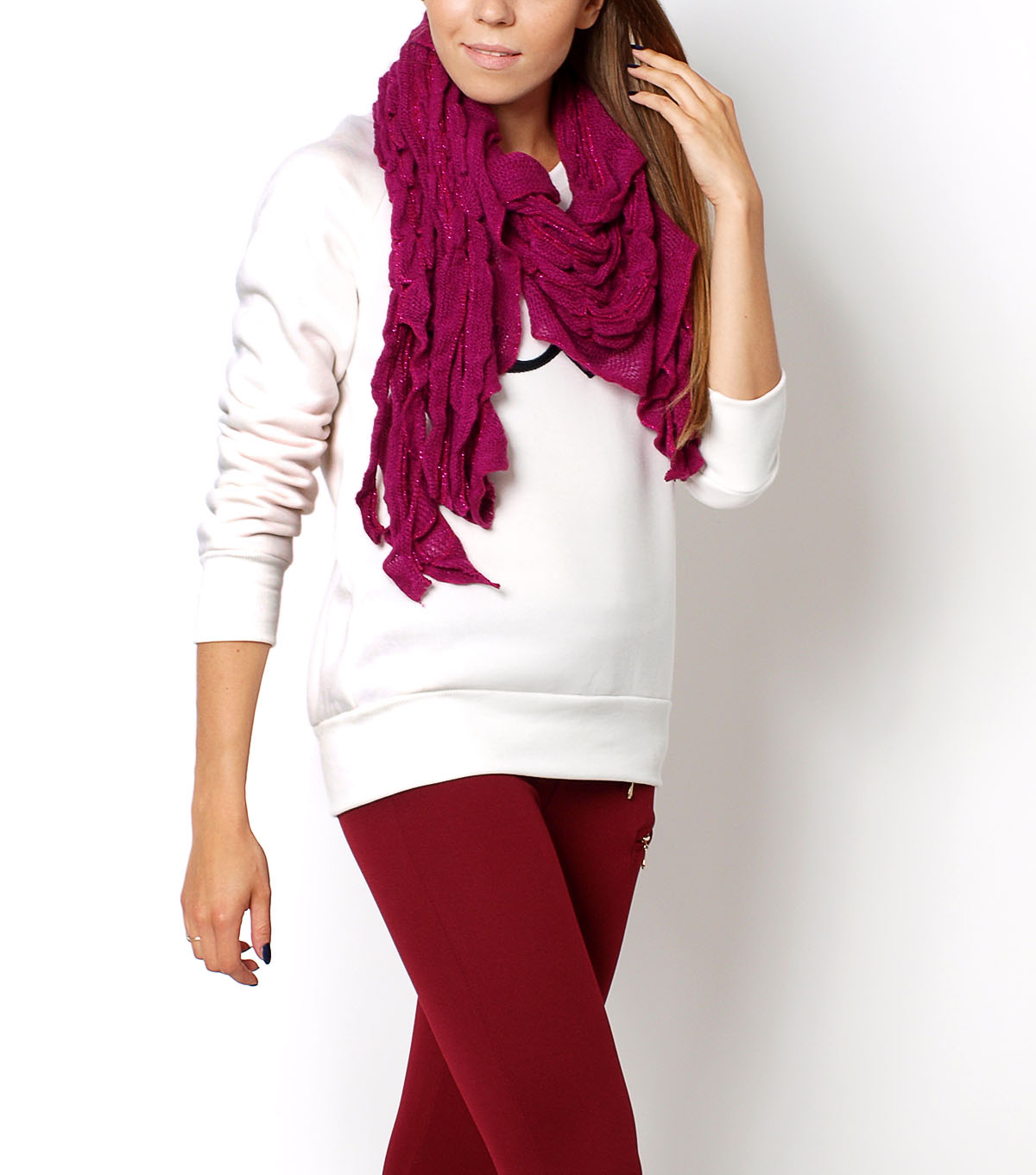 Ciepły, modny marszczony szal z błyszczącą się nitką oraz frędzelkami. Efektowny, o ciekawym splocie, bardzo przyjemny w dotyku szalik. Delikatny, nie gryzie przy użytkowaniu. Łatwy do ułożenia, ładnie otuli szyję.Materiał 100% akryl