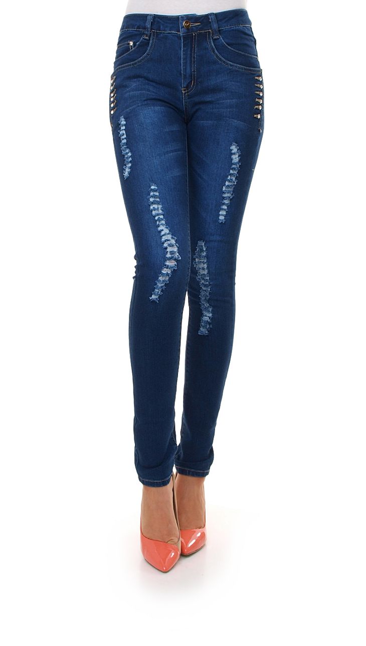 Spodnie biodrówki zapinane na zamek i guzik. Wyszczuplające, seksowne jeansowe rurki z przetarciami na nogawkach. Klasyczne, bawełniane jeansy z kieszeniami z przodu i z tyłu. Góra spodni zdobiona cyrkoniami.Skład: 70% bawełna, 27% poliester, 3% spandex