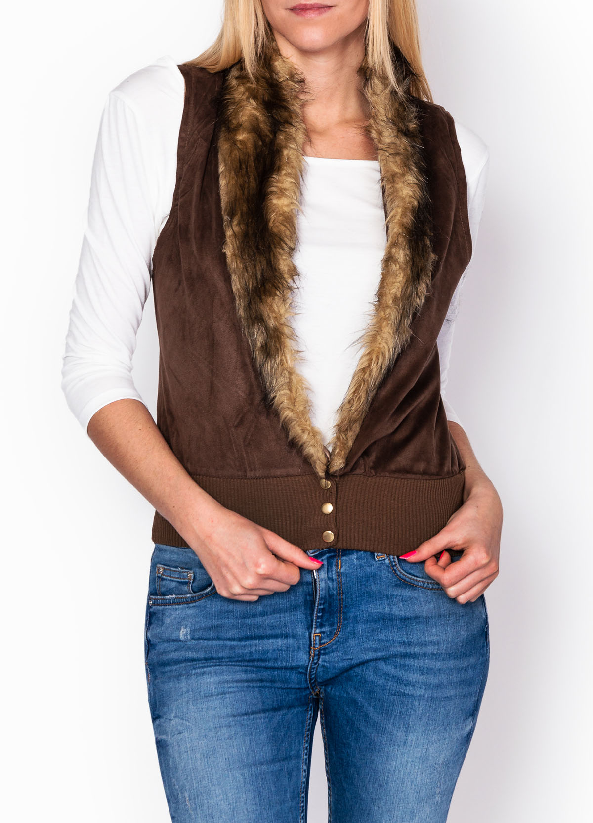 Miękka kamizelka z futerkiem, wykonana z przyjemnego materiału przypominającego zamsz. Wykładany futrzany kołnierz. Na dole zakończona ściągaczem zapinanym na trzy metalowe napy. Do wyboru klasyczne kolory. Produkt turecki dobrej jakości.Model z najnowszej jesienno-zimowej kolekcji. Zapinana kamizelka damska, fason z ładnie opadającym kołnierzem - ociepleniem na szyję. Wygodny i ciepły dodatek do codziennego lub sportowego stroju. Komfortowy i modny bezrękawnik, lekkie, ale ciepłe okrycie zapewniające wygodę i stylowy wygląd. Uniwersalna i zawsze modna. Materiał 100% poliesterModelka wzrost 175cm, na co dzień nosi rozmiar S/M