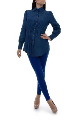 Długa jeansowa koszula taliowana w pasie gumeczką. Bawełniana bluzeczka z długim rękawem z możliwością podwinięcia do długości 3/4. Bluzka zapinana z przodu i na mankietach rękawów na guziczki. Struktura materiału marszczona z możliwością wyprasowania.Skład: 100% bawełna