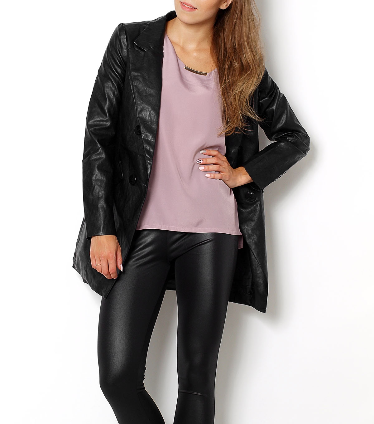 Marynarka/żakiet z ekoskóry, taliowany, z przodu kieszenie, zapinany na guziki, dłuższy fason,może spełniać rolę okrycia wierzchniego. Materiał 60% skóra ekologiczna, 40% sztuczny jedwab.Modelka wzrost 172cm, na co dzień nosi S/M, rozmiar z prezentacji produktu M