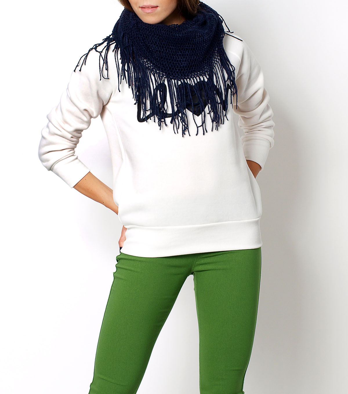 Długi mięciutki komin. Pleciony szal z oczkami i ozdobnymi frędzelkami. Przyjemny w dotyku szalik w formie tuby / tunelu, wkładany przez głowę. Łatwy do ułożenia. Można go nosić zarówno jako komin (wkładając przez głowę), ale także owijając wokół szyi jak klasyczny szalik. Idealny na chłodne zimowe dni.Skład: 100% akryl