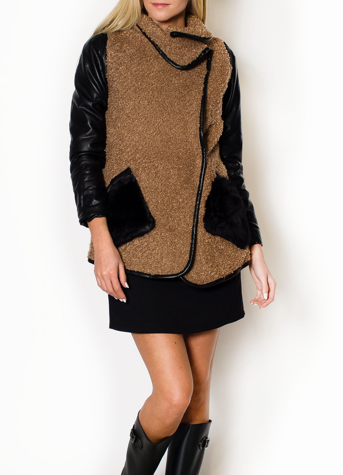 Efektowny damski płaszczyk jesienny z rękawami z eko skóry, długość mini. Kurtka na podszewce. Bez kaptura. Wykonana z ciepłego materiału typu boucle. Duży, ładnie układający się kołnierz, wykończony lamówką. Z przodu pojemne kieszenie z mięciutkiego futerka, zapinane na zamek. Zapinana na dwa zatrzaski. Produkt świetnej jakości.Praktyczne i ciepłe wykończenie stroju wyjściowego w modnym stylu. Ładnie otula sylwetkę wysmuklając ją dzięki dwu-tonowej kolorystyce. Doskonałe połączenie kolorów idealnie dopełni każdą jesienną stylizację.Materiał 90% poliester, 10% wełna / podszewka 100% poliesterModelka wzrost 175cm, na co dzień nosi rozmiar S/M