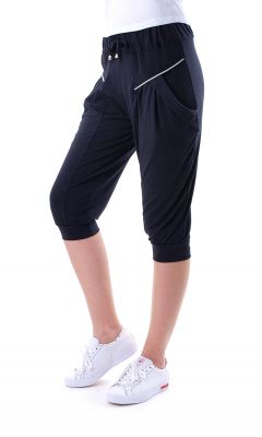 Luźne rybaczki dresowe typu pumpy. Zdobione zamkiem przy kieszeniach z przodu. Super komfortowe. W pasie ściągane sznureczkiem. Dół nogawki zakończony ściągaczem. Skład: 65% bawełna, 30% poliester, 5 elastan