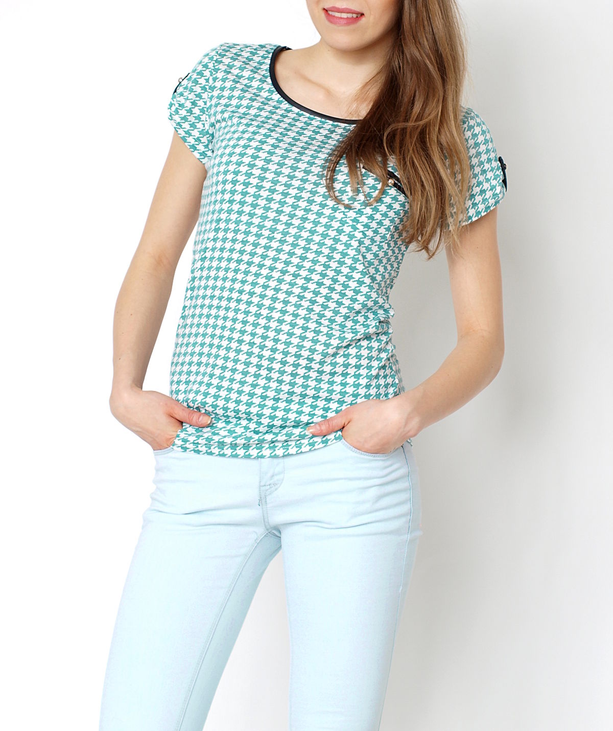 Absolutny hit tej wiosny. Bardzo stylowa bluzeczka w najmodniejszy wzór tego sezonu - pepitkę. To uniwersalny motyw, który pasuje do wielu codziennych stylizacji, jak również tych bardziej wyszukanych, eleganckich. Dwukolorowa koszulka z krótkim rękawem, o klasycznym kroju. Dekolt i rękawki zdobione wstawkami a`la skóra. Z przodu na wysokości piersi mała kieszonka. Bluzka wykonana z dobrego jakościowo materiału. Na sylwetce prezentuje się naprawdę wyjątkowo.Skład: 95% poliester, 5% spandex.Wzrost modelki: 172cmModelka ma na sobie rozmiar: S/MNa co dzień nosi rozmiar: S/M