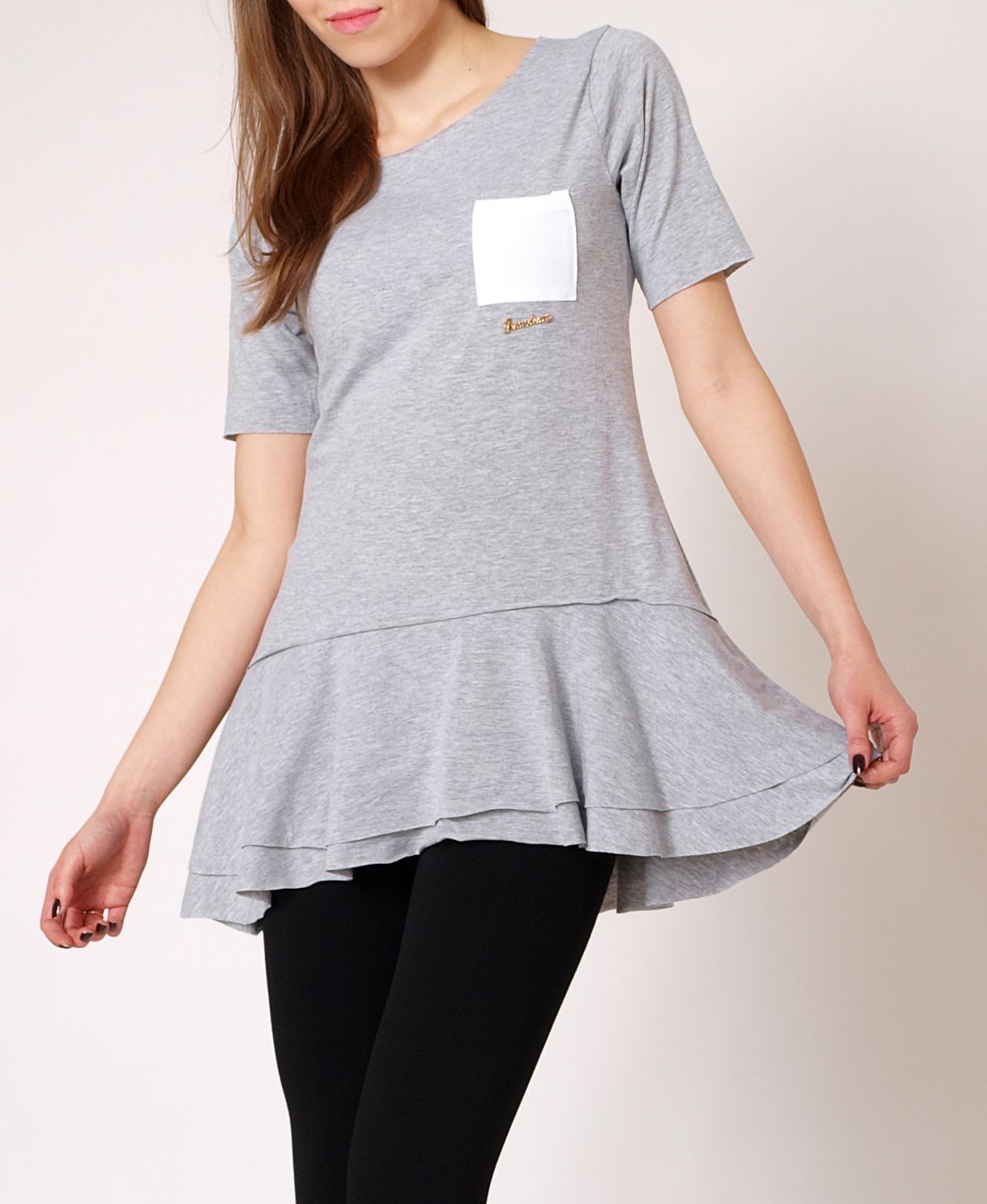 Urocza, bardzo kobieca mini sukienka z falbanką. Prawdziwy hit tej wiosny. Tunika z krótkim rękawem. Z przodu kieszonka w kontrastowym kolorze. Sukienka jest surowo wykończona. Wykonana z miłej w dotyku bawełny. Dostępna w ślicznych pastelowych odcieniach. Skład: 95% bawełna, 5% lycra.
