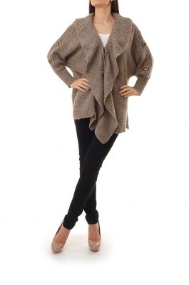 Luźny wełniany sweter kardigan,wiązany na sznureczek. Rękawy zakończone ściągaczami, zdobione dużymi guzikami. Z przodu efektowna falbana/żabot. Ciepła, gruba narzutka nietoperz, niezwykle praktyczna, a zarazem elegancka. Skład: 30% wełna, 70 akryl (wełna syntetyczna)