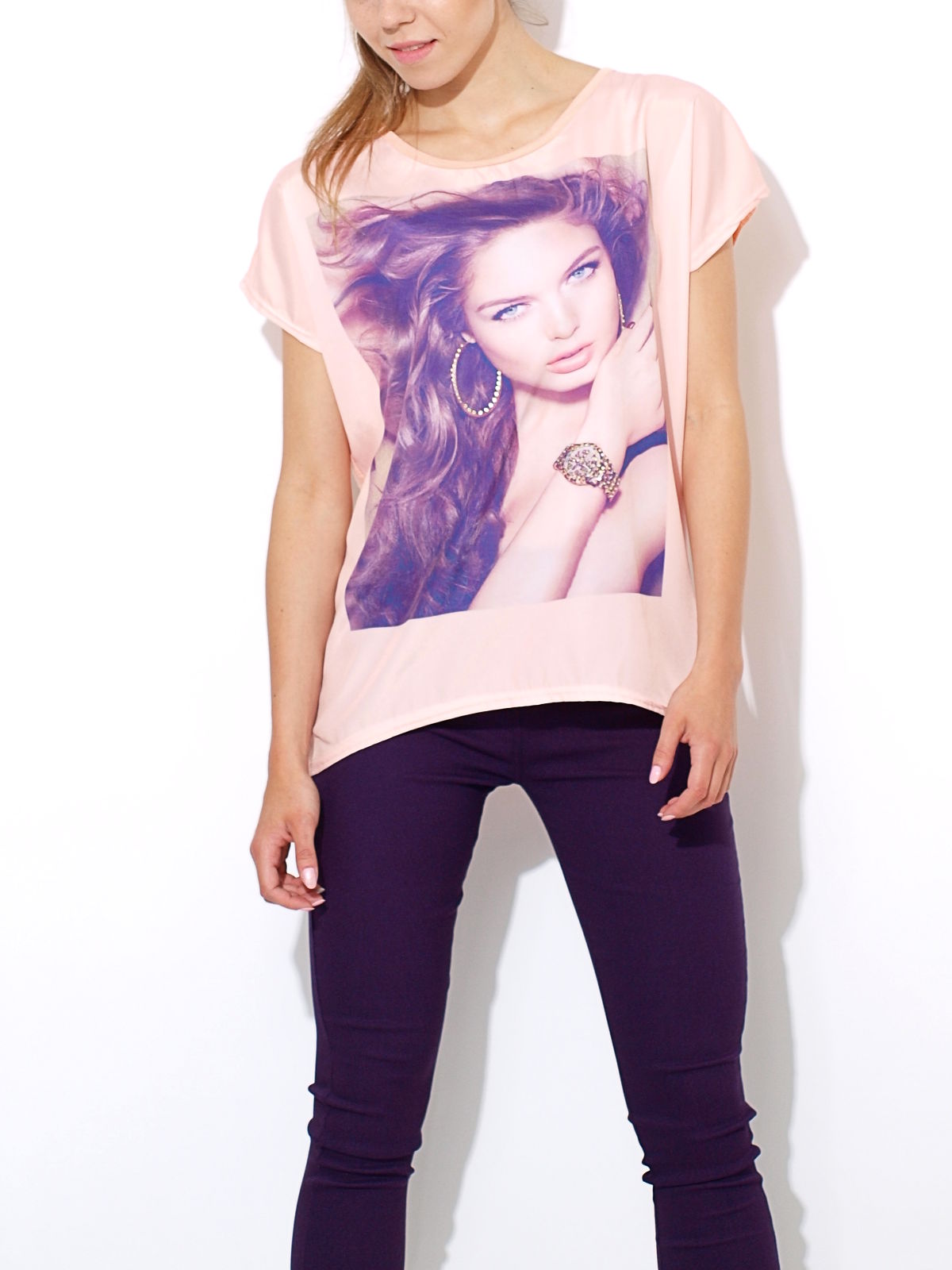 Modna bluzka z nadrukiem. Oryginalny print z postacią kobiety, przykuwa uwagę oraz rewelacyjnie komponuje się z luźnym stylem. Dodatkowo zdobiony cyrkoniami. Przód bluzki wykonany jest z delikatnie połyskującego materiału. Plecy z miękkiego, o cieniowanej fakturze. Dekolt okrągły. Asymetryczna - tył dłuższy. Bluzka świetnie prezentuje się zestawiona z kolorowymi legginsami, czy letnimi szortami. Do wyboru śliczne pastelowe odcienie.Skład: 100% poliester