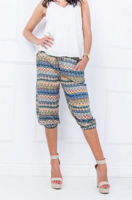 Zwiewne rybaczki, różne wzory, nogawka zakończona ściągaczem, z przodu wsuwane kieszenie, w pasie gumka.Materiał 65% bawełna, 35% poliester.Modelka wzrost 175cm, na co dzień nosi S/M, rozmiar z prezentacji produktu L/XL