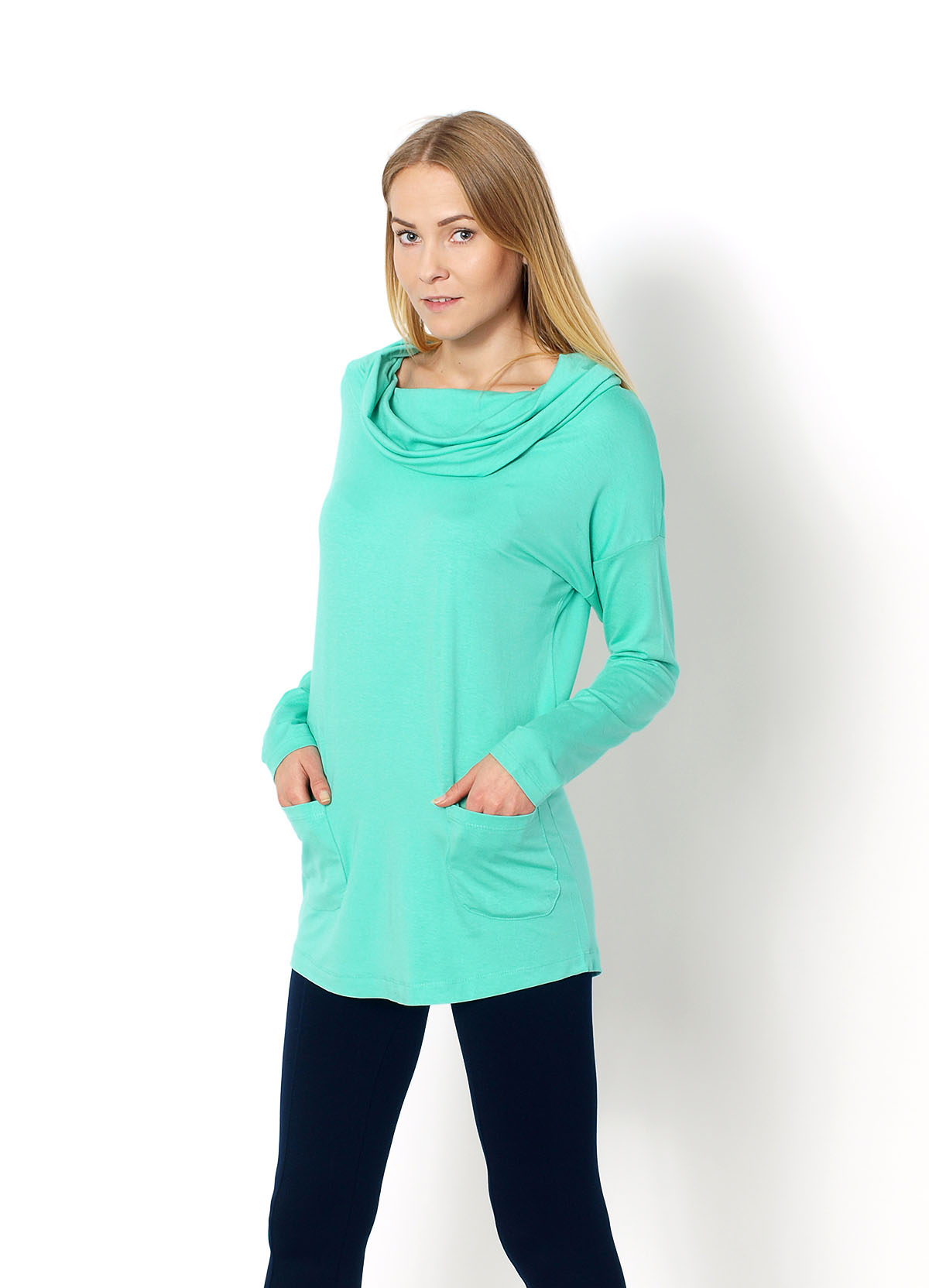 Luźna tunika z szerokim, lejącym golfem, kieszenie z przodu, fason oversize, elastyczny materiał. Materiał 90% bawełna, 10% elastanModelka wzrost 175cm, na co dzień nosi S/M, rozmiar z prezentacji produktu uniwersalny.