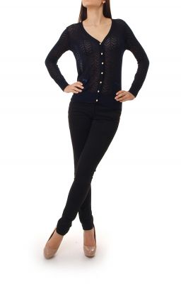 Śliczny ażurowy sweterek. Kardigan z długim rękawem zapinany na złote guziczki zdobione cyrkoniami. Dół oraz rękawki zakończone elastycznym ściągaczem. Dekolt w serek. Z przodu po obu stronach kieszonki zdobione małymi kokardkami, które nadają sweterkowi niezwykłego uroku. Idealny jako narzutka. Dostępny w modnych tej jesieni kolorach.Skład: 40% wełna, 35% viskoza, 25%elastan