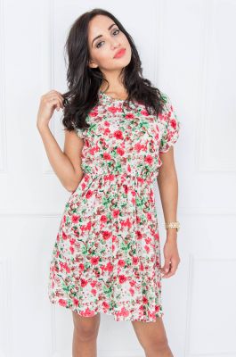 Sukienka, krótki rękaw, zwiewna, w pasie gumka, dekolt okrągły, z przodu wsuwane kieszenie Materiał 65% bawełna, 35% poliester.Modelka wzrost 175cm, na co dzień nosi S/M, rozmiar z prezentacji produktu M/L