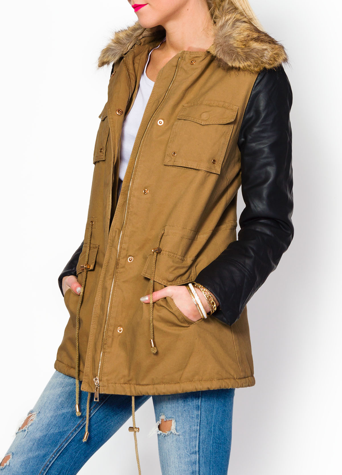 Damska kurtka z kapturem, o dłuższym fasonie, w czterech klasycznych kolorach do wyboru. Od wewnątrz ocieplana kozuszkiem. Zapinana na zamek i napy. W talii przeszycie i sznureczki do ściągnięcia, które ładnie podkreślą sylwetkę. Na dole ściągacz ze sznurków. Charakterystyczne rękawy z eko skóry w kolorze czarnym. Zapinana na zamek i napy. Kaptur wykończony futerkiem - futrzany kołnierz można odpiąć. Z przodu cztery kieszenie na wysokości klatki i bioder. Na całej powierzchni liczne przeszycia.Kurtka jest bardzo wygodna i dobrze spisze się w jesienno - zimowym okresie. Ciepłe, praktyczne i uniwersalne dopełnienie zimowego stroju, z modnym krojem. Ładnie otula sylwetkę wysmuklając ją dzięki dwu-tonowej kolorystyce. Doskonałe połączenie kolorów idealnie dopełni każdą stylizację.Materiał 100% bawełnaModelka wzrost 175cm, na co dzień nosi rozmiar S/M