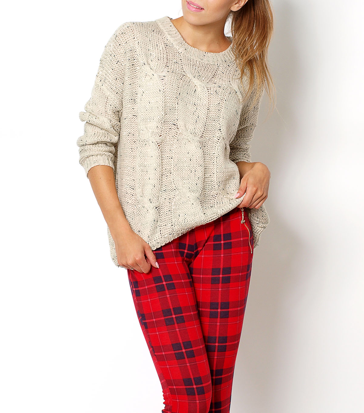 Ciepły, sweter typu oversize w modne warkocze. Dół i rękawy zakończone elastycznym ściągaczem. Szeroki, asymetryczny sweterek z dłuższym tyłem. Luźny, komfortowy kardigan, idealny na chłodniejsze zimowe dni.Skład: 100% akryl (wełna syntetyczna)