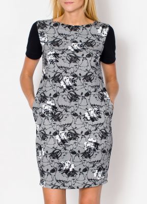 Sukienka z krótkim rękawem, kieszenie przy biodrach. Tył czarny, gładki. Na przodzie czarno-białe kwiaty. Fason z zaznaczoną linią bioder. Materiał: 95% bawełna, 5% lycra.Modelka: wzrost 175 cm, na co dzień nosi S/M, rozmiar z prezentacji produktu M.