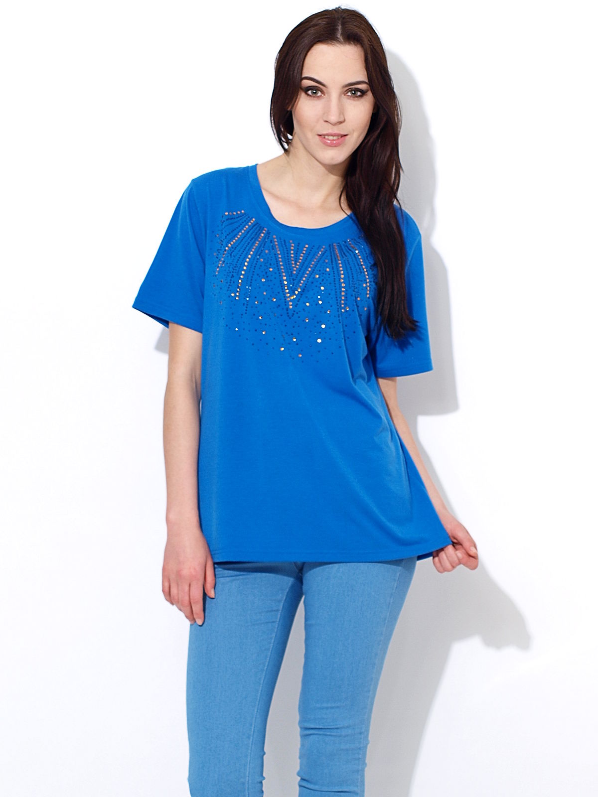 Bluzka o prosty, klasycznym kroju. Koszulka z krótkim rękawem. Dekolt okrągły, niżej zdobiony cyrkoniami układającymi się w oryginalny wzór. Przyjemny, miły w dotyku materiał zapewnia komfort oraz wygodę. bardzo uniwersalny model, który świetnie sprawdzi się noszony w wielu zestawieniach. Do wyboru piękne letnie kolory,Wzrost modelki: 175cmModelka ma na sobie rozmiar: MNa co dzień nosi rozmiar: S