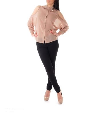 Luźna, jak kimono koszula zapinana na guziczki, z odkrytymi ramionami. Staranne wykonanie. Kołnierzyk zdobiony ćwiekami.Skład: poliester