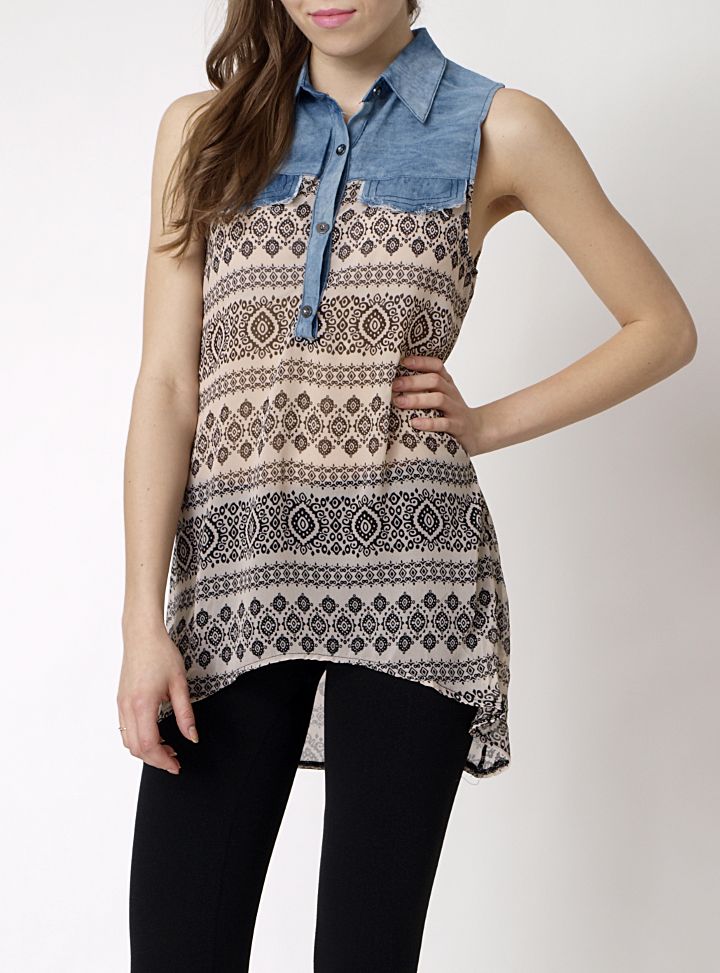Rewelacyjna koszula bez rękawów. Góra rozpinana, z dekatyzowanego jeansu. Dół - delikatna mgiełka w modne, oryginalne wzory. Bluzka z kołnierzykiem. Asymetryczny krój, to prawdziwy hit tego sezonu. Bardzo efektownie prezentuje się na sylwetce. Świetna propozycja na ożywienie każdej wiosennej stylizacji.Skład: 35% bawełna, 65% poliester.