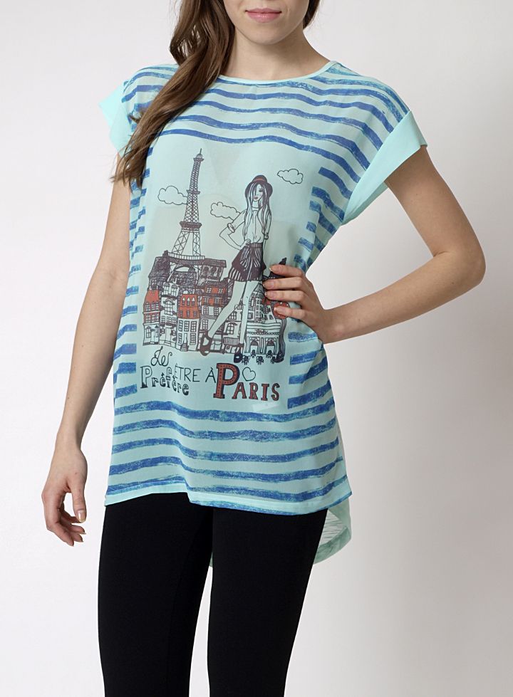 Kolorowa, szyfonowa bluzka z krótkim rękawkiem. Przód z lekkiej mgiełki z kolorowym nadrukiem. Plecy wykonane z miękkiego, przyjemnego w dotyku materiału. Asymetryczna - tył delikatnie dłuższy. Zwiewna, bardzo wygodna. Niezwykle modny w tym sezonie krój, oraz oryginalne wzornictwo. Świetnie prezentuje się np. z gładkimi legginsami. Idealnie uzupełnienie wiosennych stylizacji. Skład: 100% poliester.