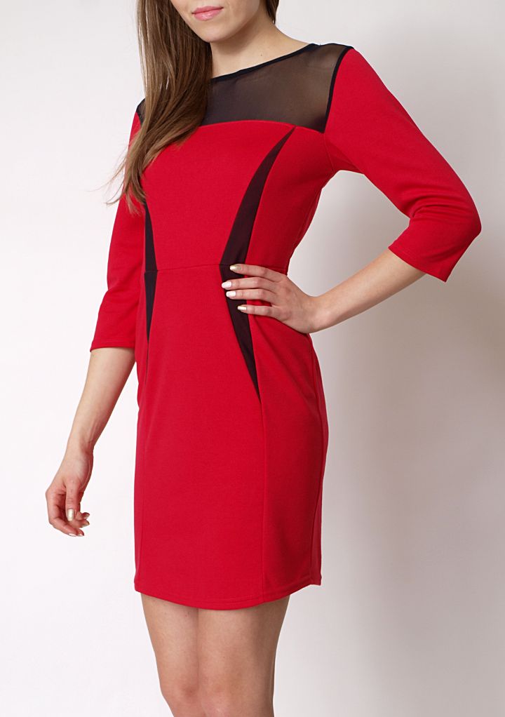 Sukienka z czarną siateczką na dekolcie, plecach, oraz w talii. Rękawy o długości 3/4. Śliczna sukienka z zaznaczoną talią. Długość midi/mini. Na plecach zapinana na ozdobny guziczek. Wykonana z przyjemnego w dotyku bawełnianego materiału. Ładnie podkreśla figurę, Klasyczny, ołówkowy krój sprawia, że sukienka idealnie pasuje na różne okazje.Skład: 95% bawełna, 5% lycra.
