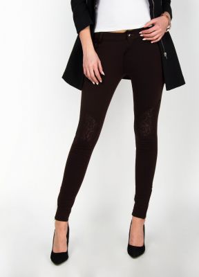 Spodnie, koronka na kolanach, zapinane na zamek i guzik, w pasie szlufki, kieszenie wsuwane z przodu, z tyłu imitacje kieszeni, na dole nogawek zamki. Materiał 95% bawełna, 5% lycra. Modelka wzrost 175cm, na co dzień nosi S/M, rozmiar z prezentacji produktu 38