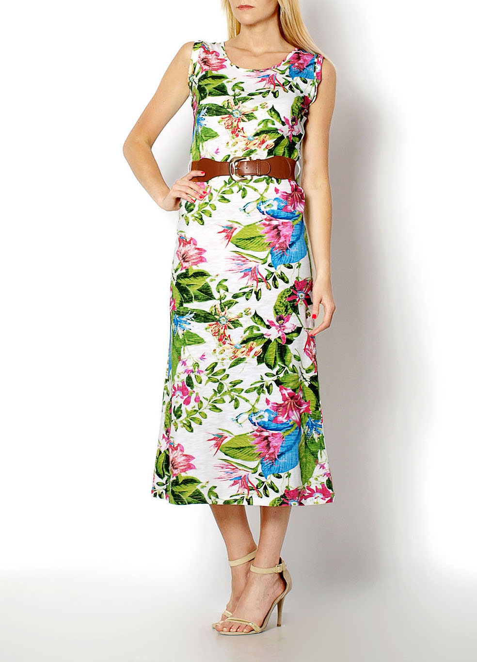 Długa sukienka w kwiatowy print, bez rękawów, dekolt okrągły. Bawełniany fason z paskiem w zestawie. Materiał: 100% bawełna.Modelka: wzrost 175 cm, na co dzień nosi S/M, rozmiar z prezentacji produktu S/M.