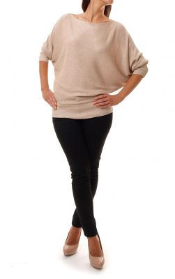 Ciekawe kimono przeszywane srebrną, mieniącą nitką. Bluzka z rękawem o długości 3/4 zakończonym ściągaczem. Dół bluzeczki również zakończony elastycznym ściągaczem. Luźny sweter / nietoperz. Skład: 65% bawełna, 35% poliester