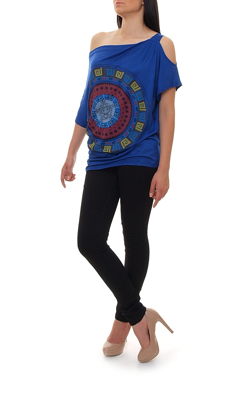 Nietoperz z aztecką aplikacją z przodu. Bluzka w modnym, luźnym fasonie z drapowanym dekoltem. Odkryte ramię. Stylowe kimono.Skład: 95% wiskoza, 5% elastan