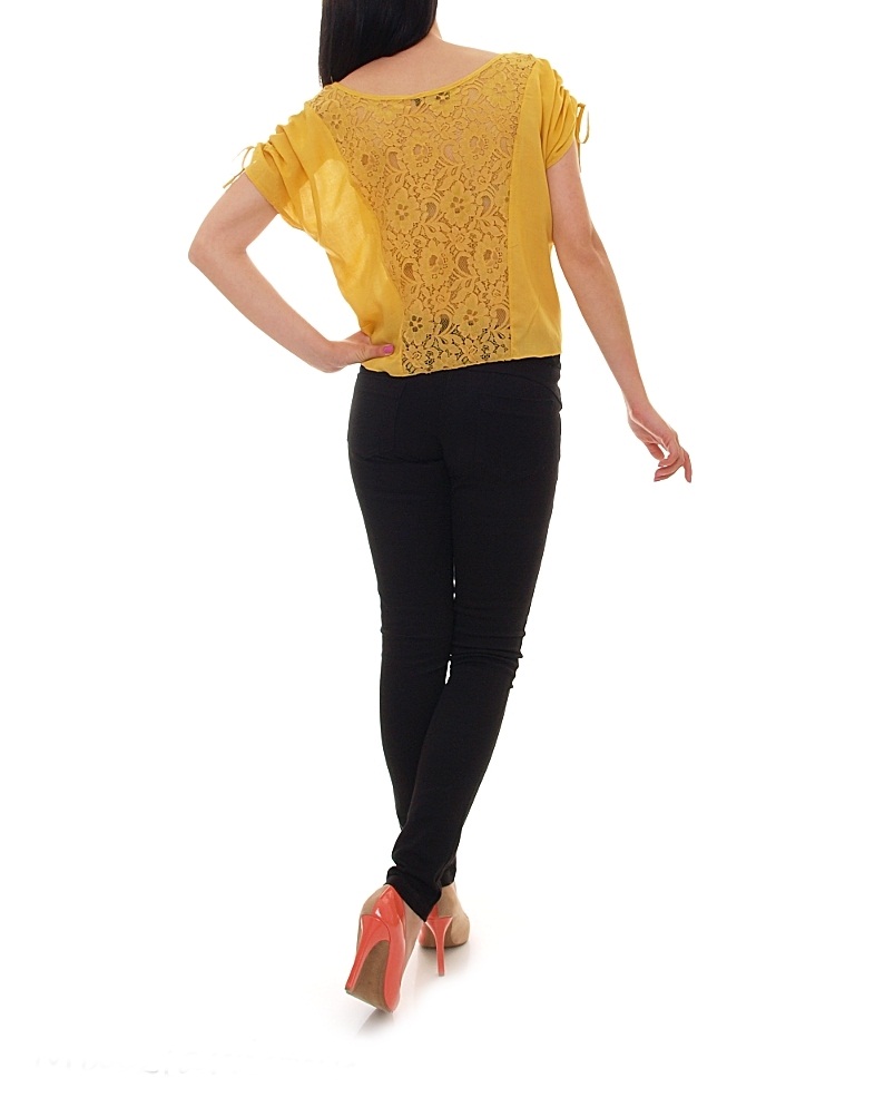 Seksownie wiązana na biodrach bluzka. Misternie wykonane koronkowe plecy. Ściągane krótkie rękawki.Skład: 65% bawełna, 35% poliester