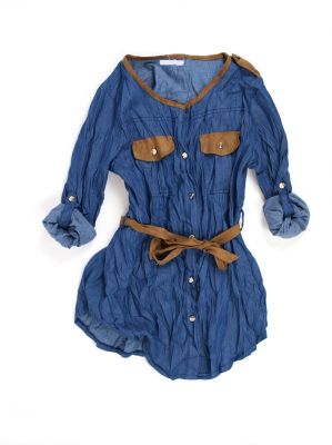 Koszula / tunika wykonana z bawełnianej imitacji jeansu. Struktura materiału marszczona. Rękawy długie. Możliwa stylizacja z podwiniętymi rękawami. Zapinana na złote butony. W pasie wiązana brązową tasiemką.Skład: 100% bawełna
