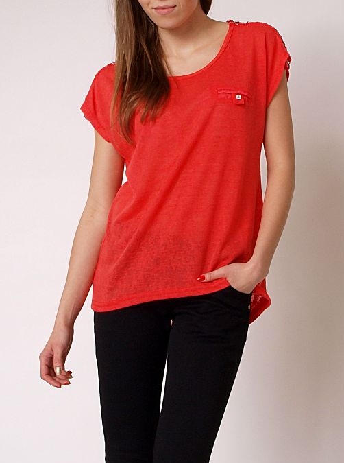 Modna bluzka bez rękawów. Na ramionach oryginalne pagony zdobione nitką i delikatnym łańcuszkiem. Z przodu, na wysokości piersi, imitacja kieszeni. Tył delikatnie dłuższy. Mega modny tej wiosny luźny krój. Materiał przyjemny, mięciutki w dotyku. Tunika ładnie układa się na sylwetce. Idealna dla pań o każdym typie figury. Dostępna w pięknych pastelowych odcieniach.Skład: 65% bawełna, 35% poliester.