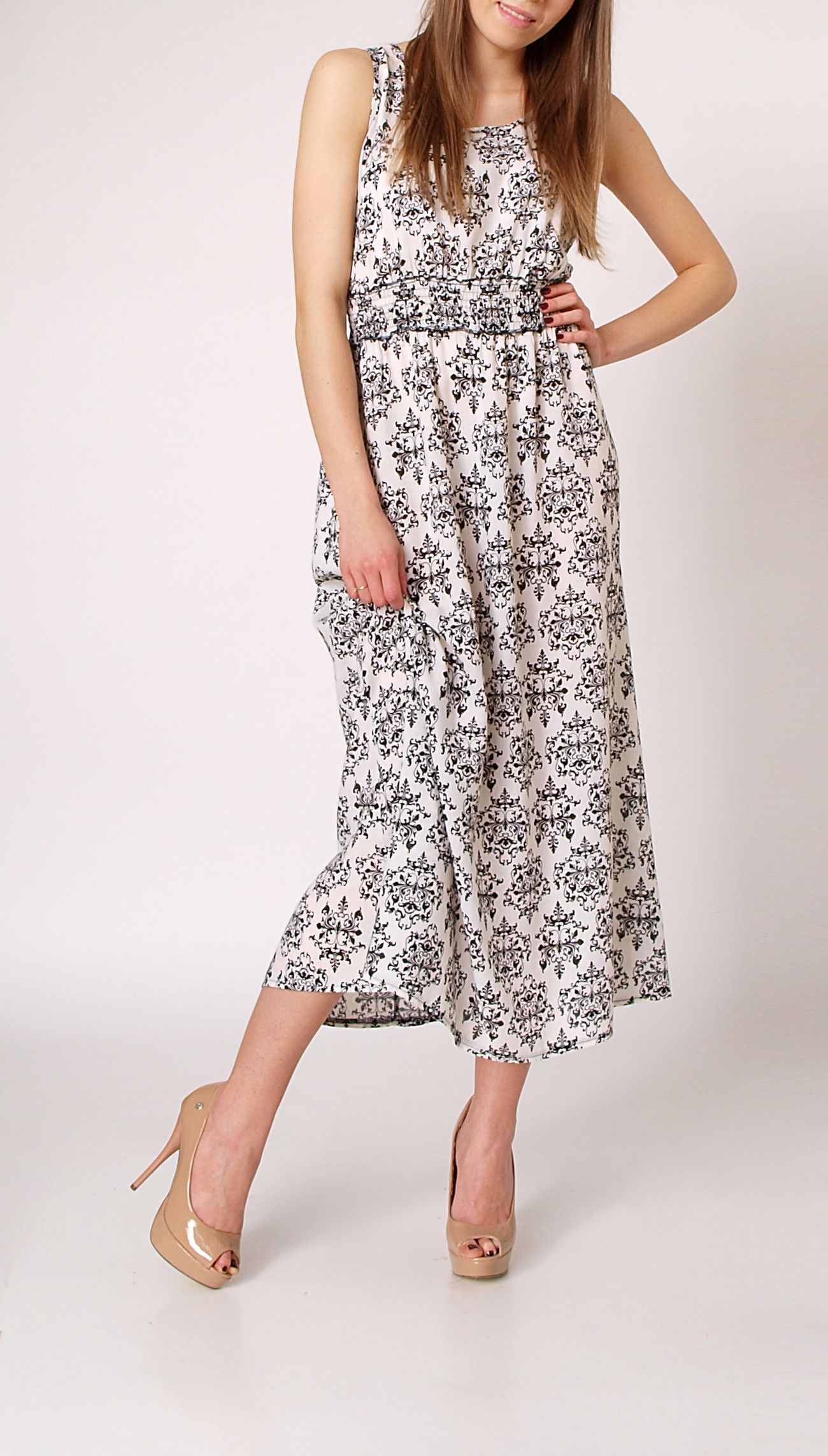 Śliczna sukienka w stylu retro. Zwiewna maxi sukienka bez rękawów w stylu vintage. Wykonana z bawełnianego, przyjemnego materiału. Ściągana w talii, dzięki czemu biust jest ładnie wyeksponowany. Oryginalne wzornictwo, oraz wygodny, przewiewny krój sprawia, że sukienka świetnie prezentuje się na sylwetce i jest doskonałą propozycją na ciepłe, letnie dni. Skład: 100% bawełna